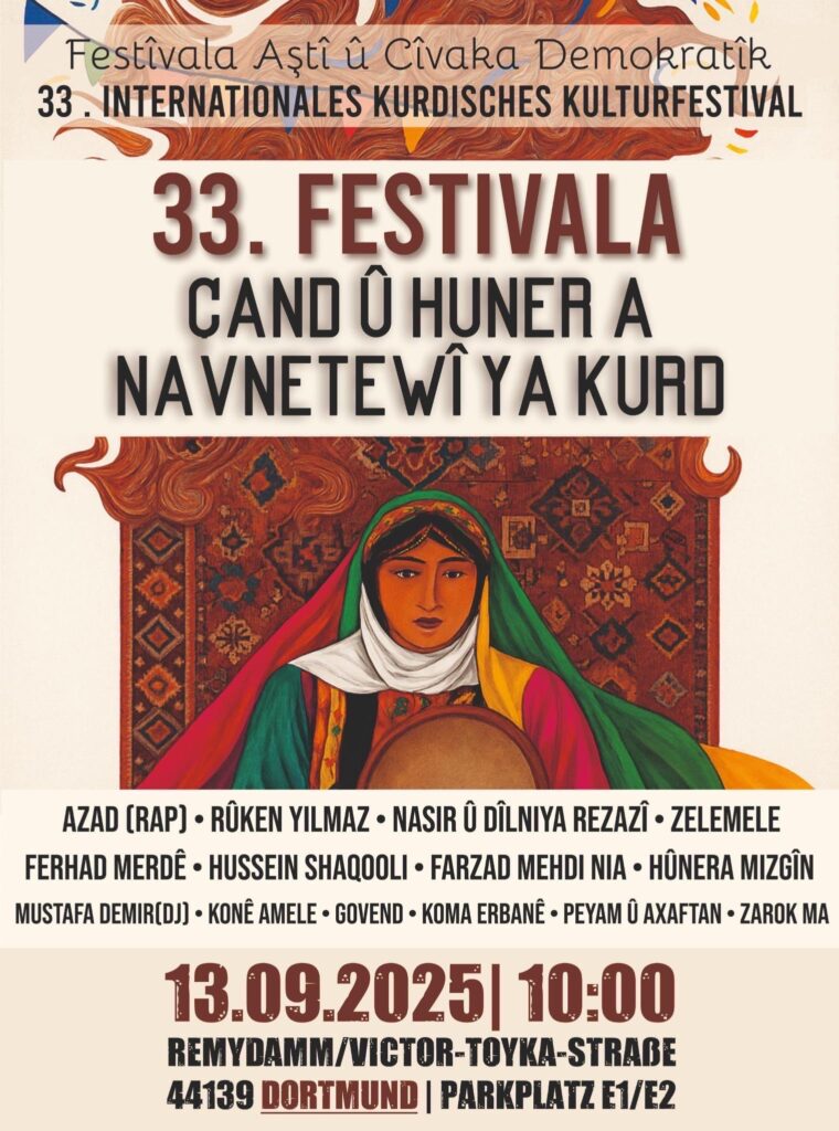 Wir, die Konföderation der Gemeinschaften Kurdistans in Deutschland (KON-MED), schließen uns dem Aufruf des europaweiten kurdischen Dachverbands KCDK-E und der Kurdischen Frauenbewegung in Europa TJK-E an und laden herzlich zum 33. Internationalen Kurdischen Kulturfestival am 13. September 2025 in Dortmund ein.